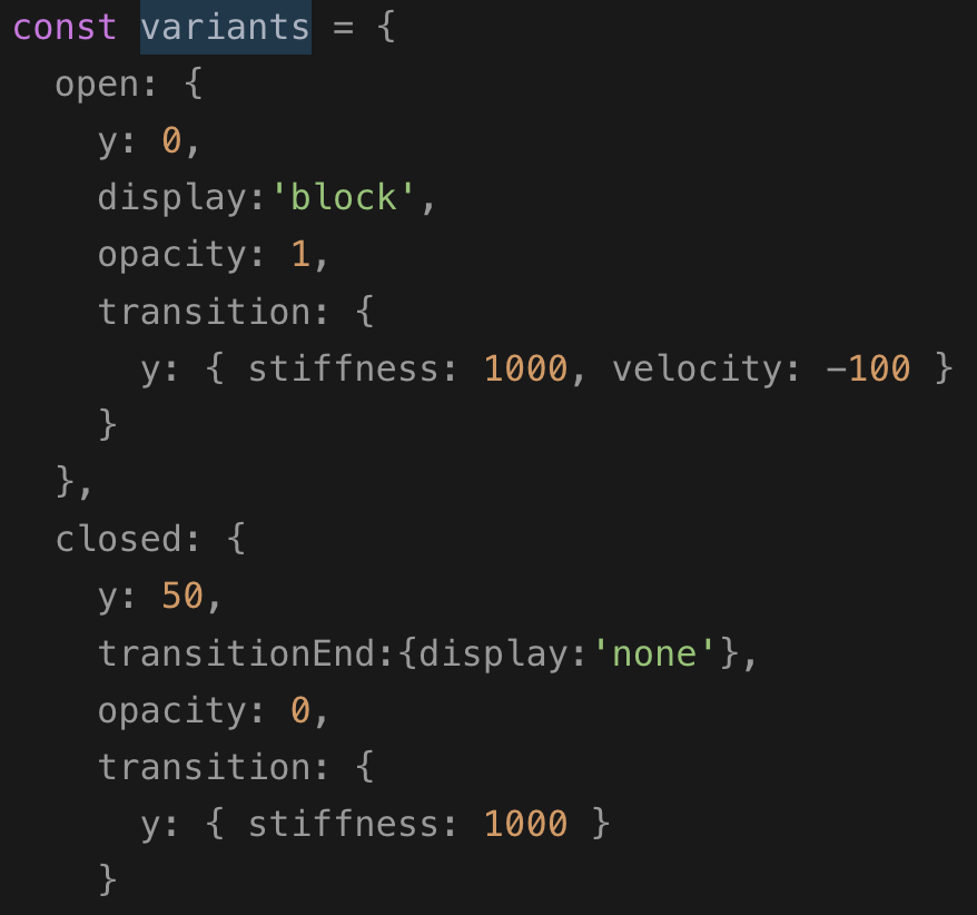 나는 MenuItem의 variants 에서 open 에서는 display:'block' 으로 화면에 보이게 하고 closed에서는 transitionEnd를 사용해 애니메이션을 좀 더 부드럽게 나오도록 했다.